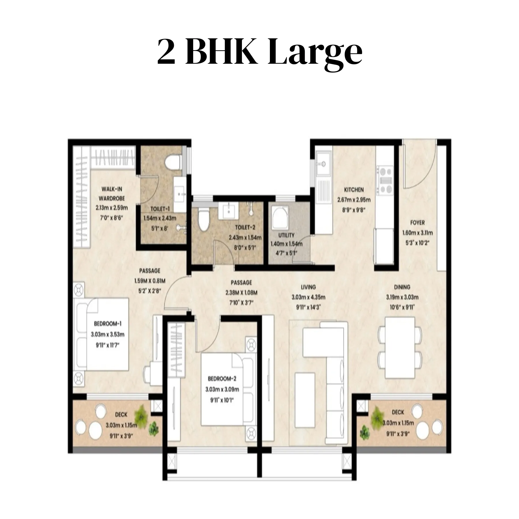 The 2 BHK Large configuration builds on the Regular layout by offering enhanced space and better proportions across key areas. The living and dining zone is noticeably more expansive, allowing greater flexibility in furniture placement and creating a more relaxed social environment. Dual decks connected to the living area and bedrooms improve cross-ventilation and bring in abundant daylight. The kitchen is larger and better organised, with a dedicated utility area that improves workflow and storage. The master bedroom includes a walk-in wardrobe and attached bathroom, adding a layer of luxury and comfort. The second bedroom is generously sized, suitable for guests, children, or a home workspace. This floor plan is ideal for families upgrading from a standard apartment and seeking extra breathing space without moving to a higher configuration.