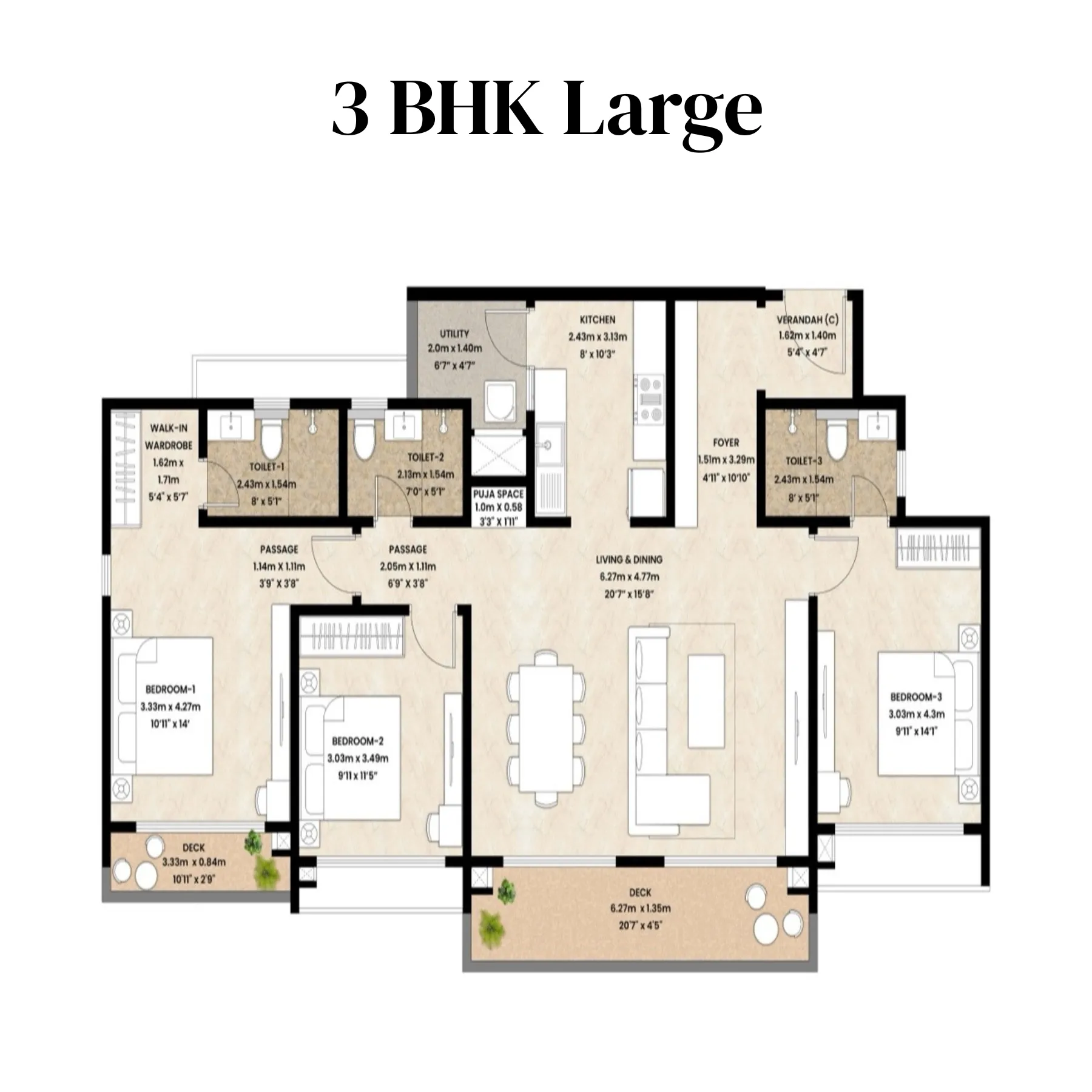 The 3 BHK Large layout is crafted for families who appreciate expansive interiors and a more luxurious sense of space. The living and dining area is significantly larger, designed to comfortably host gatherings while still feeling open and uncluttered. A wide deck extends the living space outdoors, enhancing light and ventilation. The kitchen is generously sized with a dedicated utility area, supporting both daily cooking and storage needs. All three bedrooms are larger in proportion, with the master bedroom offering a walk-in wardrobe and attached bathroom that feels like a private retreat. Secondary bedrooms are equally comfortable, suitable for family members who value personal space. With wider passages, larger rooms, and superior flow, this configuration is ideal for long-term family living with elevated comfort.