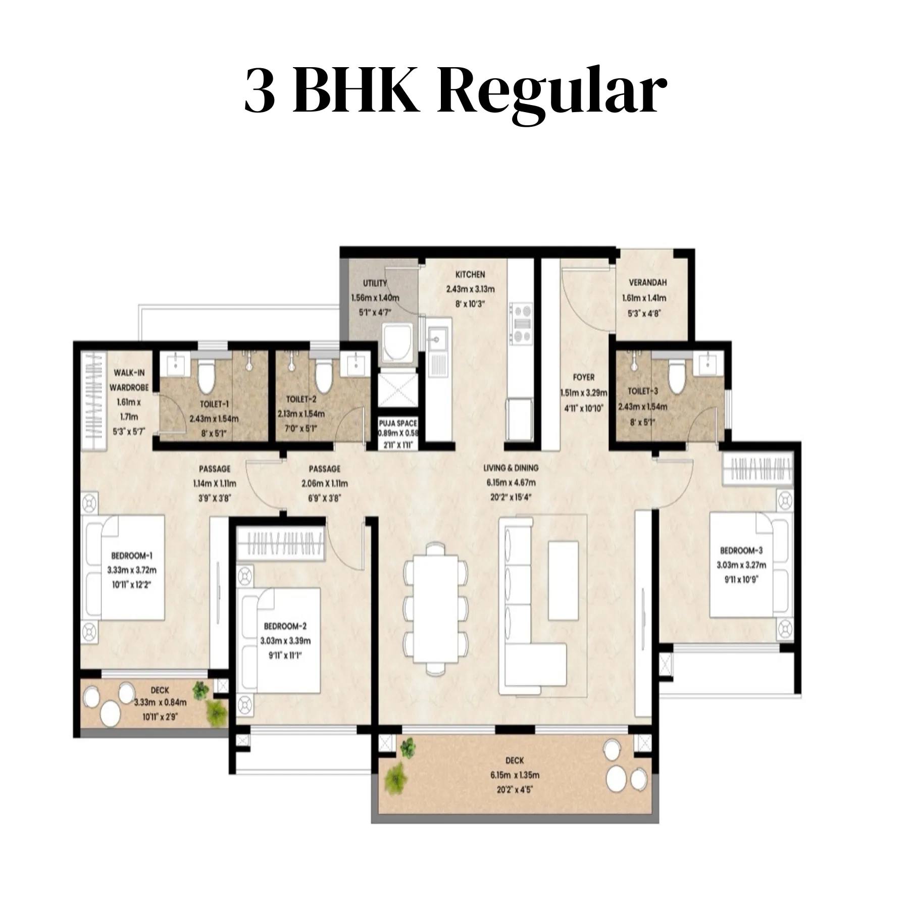 The 3 BHK Regular floor plan is thoughtfully designed for growing families who value balance and everyday practicality. A defined foyer opens into a spacious living and dining area that connects directly to a large deck, creating a bright and inviting central space. The kitchen is efficiently planned with an attached utility area, keeping functionality high without encroaching on living spaces. Three bedrooms are positioned along a passage for privacy, with the master bedroom featuring a walk-in wardrobe and attached bathroom. The additional bedrooms are well-sized and supported by nearby bathrooms, making them suitable for children, guests, or work-from-home use. Clear zoning between common and private areas ensures comfort for all family members. This layout delivers a well-rounded home that combines space efficiency with premium livability.
