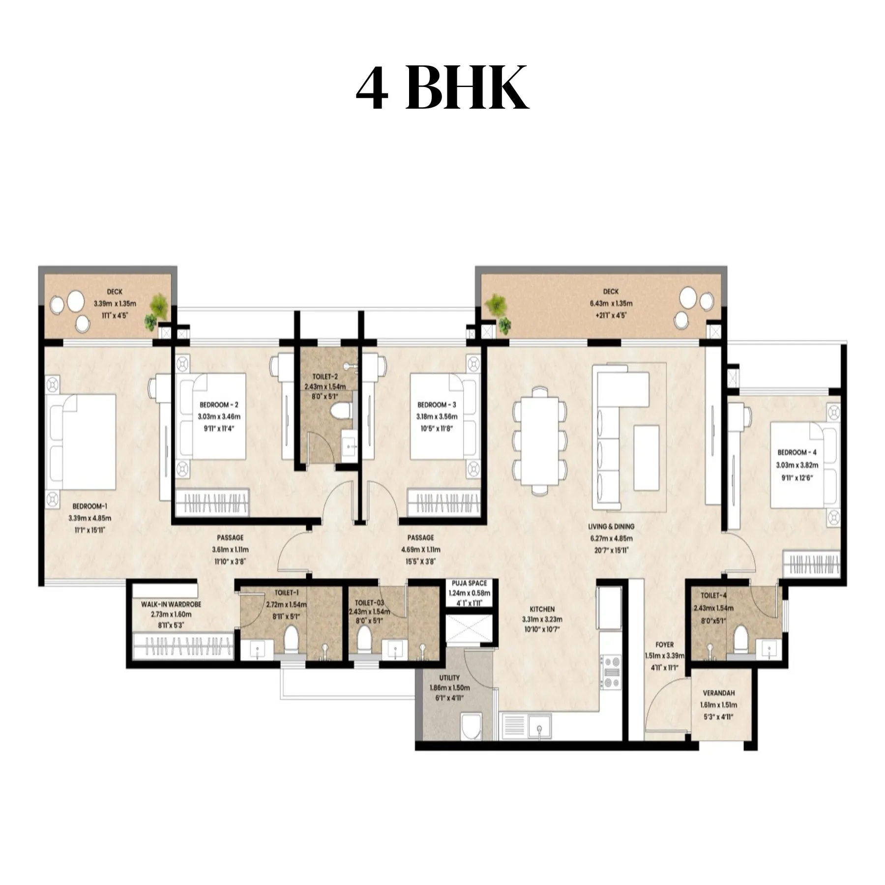 The 4 BHK floor plan represents the most spacious and premium offering, designed for large families or buyers seeking uncompromised comfort. Entry through a defined foyer leads into a grand living and dining area that opens to a wide deck, making it ideal for entertaining and family gatherings. The kitchen is well-sized with a dedicated utility area, ensuring efficiency without interfering with living spaces. Four generously sized bedrooms are thoughtfully distributed to maximise privacy, with multiple attached bathrooms enhancing convenience. The master bedroom features a walk-in wardrobe and a deck, creating a true private retreat. Wide passages and multiple outdoor connections enhance airflow and openness throughout the home. This layout delivers a refined, long-term luxury living experience with clearly defined social and private zones.